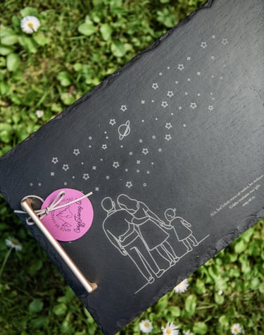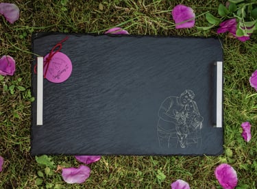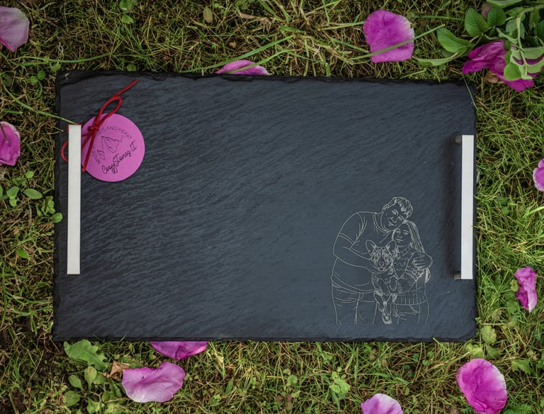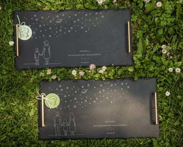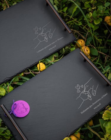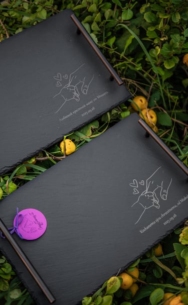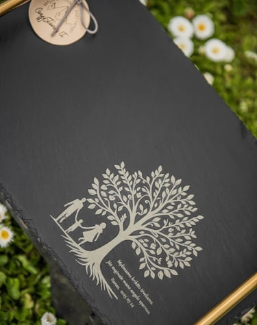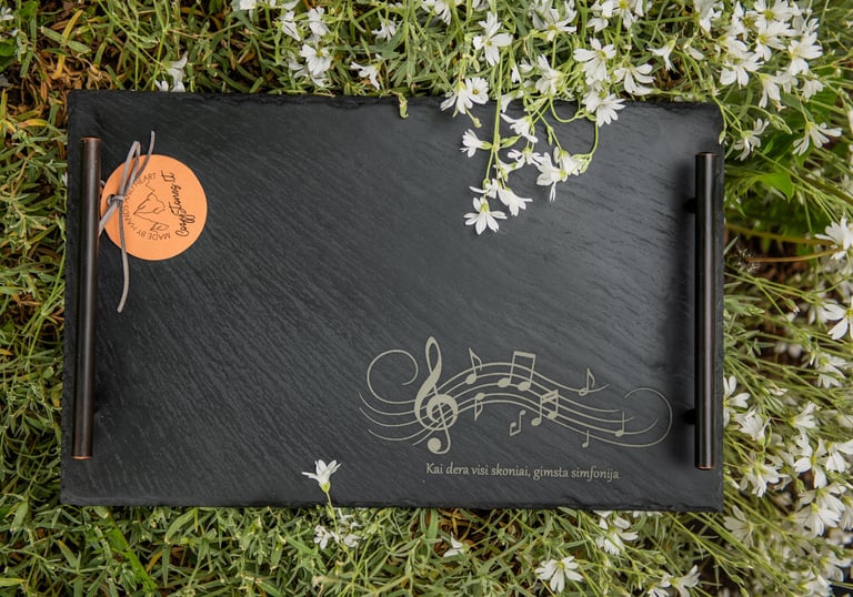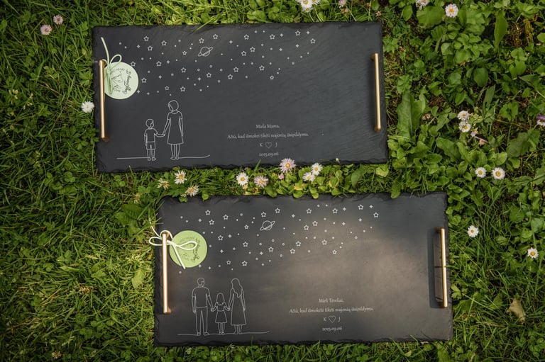 Esame tam, kad padėtume Jums sukurti išskirtines personalizuotas dovanas. CozyStones.lt gaminami natūralaus skalūno padėklai su išgraviruotais Jūsų pageidaujamais piešiniais bei žodžiais - graži ir praktiška dovana. Realizuosime Jūsų idėjas, o jeigu reikės, pasiūlysime savų. Padėklų dydis 50x25 arba 40x25 cm. Kaina, priklausomai nuo dydžio, graviravimo sudėtingumo ir rankenėlių tipo.