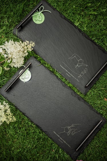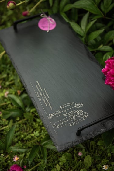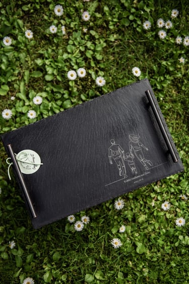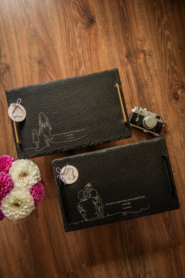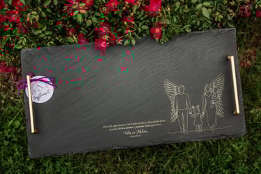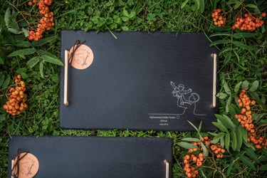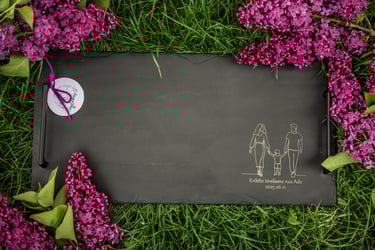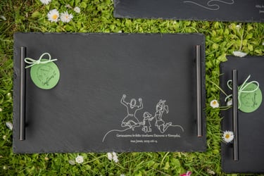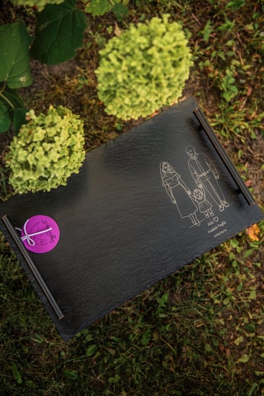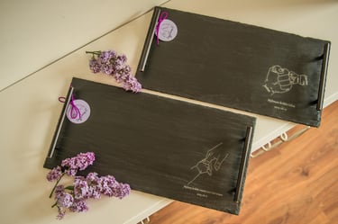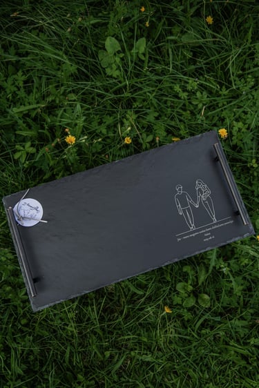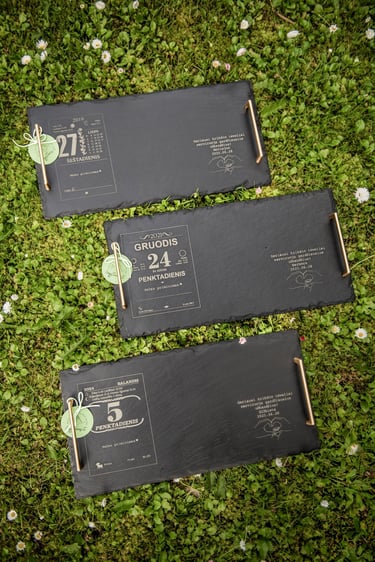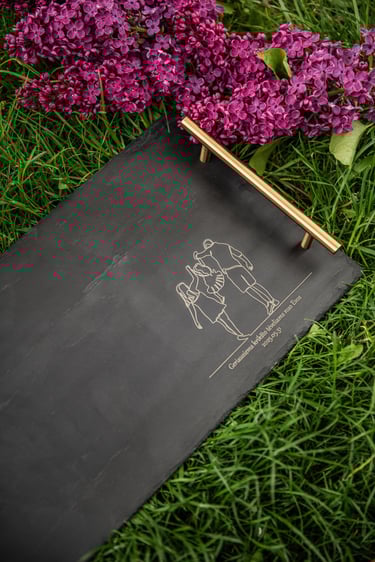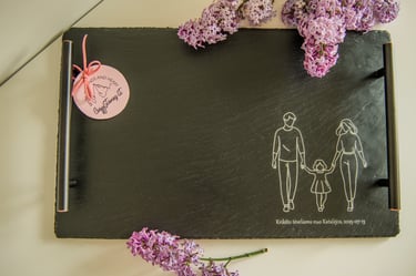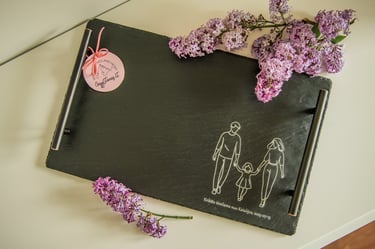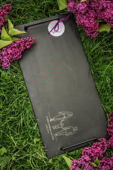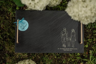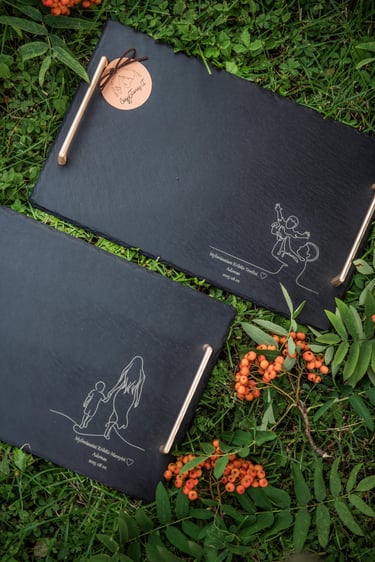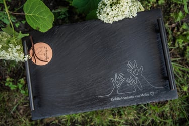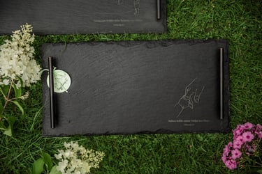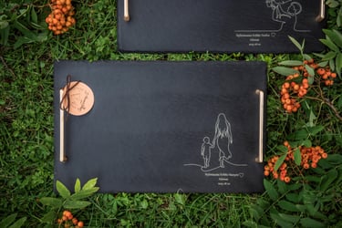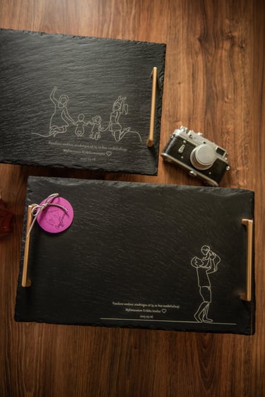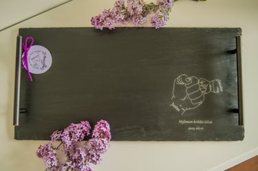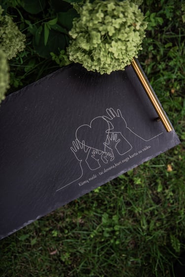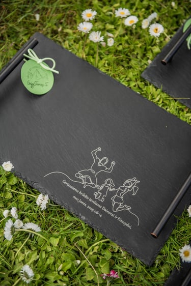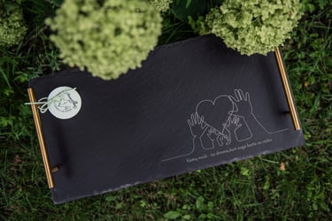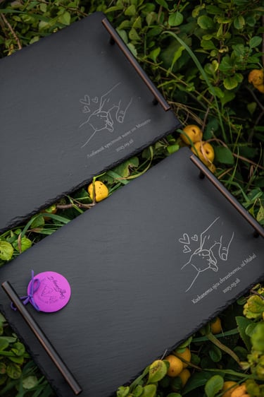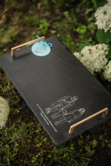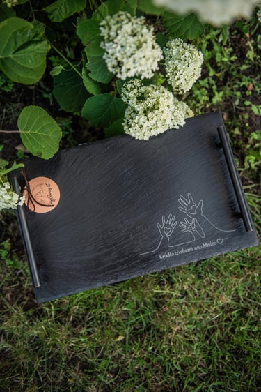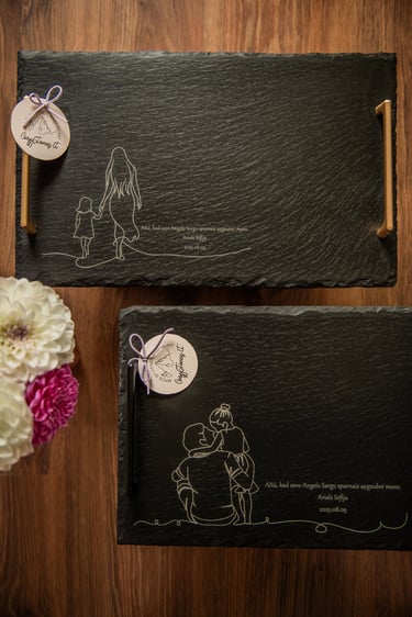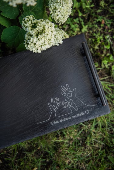 Natūralaus akmens padėklai su išgraviruotais norimais žodžiais ir piešiniais – puikus būdas parodyti dėmesį ir padovanoti tokią dovaną, kuri tikrai bus ilgai naudojama ir primins jūsų šventę. Tai gali būti KVIETIMAI BŪSIMIEMS KRIKŠTO TĖVAMS, taip pat padėkos dovanos KRIKŠTATĖVIAMS, SENELIAMS, PROSENELIAMS bei kitiems svarbiems žmonėms. Galime įgyvendinti jūsų idėjas, o taip pat pasiūlyti savų. Galime pasiūlyti skirtingų atspalvių bei formų rankenėles – tai padeda priderinti dovaną prie namų interjero.
